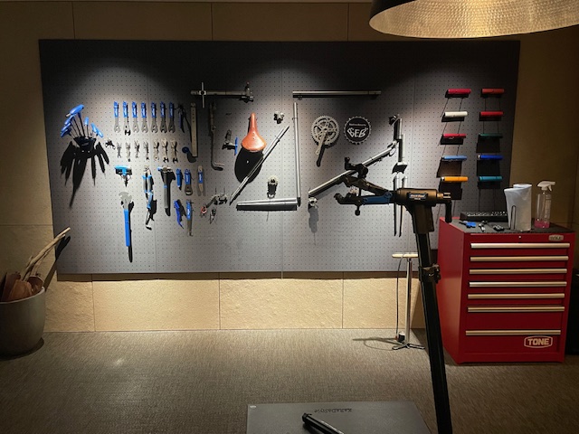 空気入れや工具のある専用スペースや洗濯乾燥機の共用スペースあり、壁のスクリーンには自転車レースが上映されていました。カードゲームやボードゲームも自由に使え、大人数で来るとより楽しめそうです。専用の裏通路でコンビニや薬局に雨にぬれずスグに買い出しに行けますし、便利で快適です。
