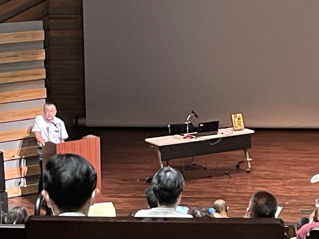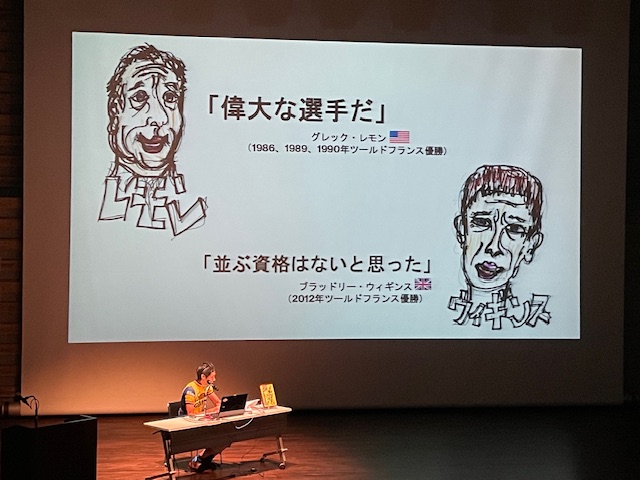 白井さんは2014年のイタリア映画「パンター二 海賊とよばれたサイクリスト」について自筆のスケッチ画と併せて熱弁、34歳で逝去したイタリアのロードバイク選手マルコ・パンター二の生き様を描いた映画のみどころを解説、白井さんは自転車切り絵作家としても活動していますが、このような講演は公演は今回が初めてだったようです。